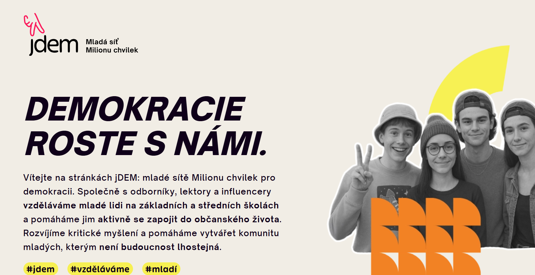 Od května jsme spustili Mladou síť – jDEM, platformu pro mladé lidi, kteří chtějí aktivně měnit své okolí. Celý projekt vychází z myšlenky, že demokracie potřebuje péči všech generací – včetně té nejmladší. V rámci projektu pořádáme workshopy a besedy na školách, kde se věnujeme tématům jako kritické myšlení a občanská angažovanost, propojujeme mladé napříč republikou a podporujeme je v tom, aby se zapojili do veřejného života.